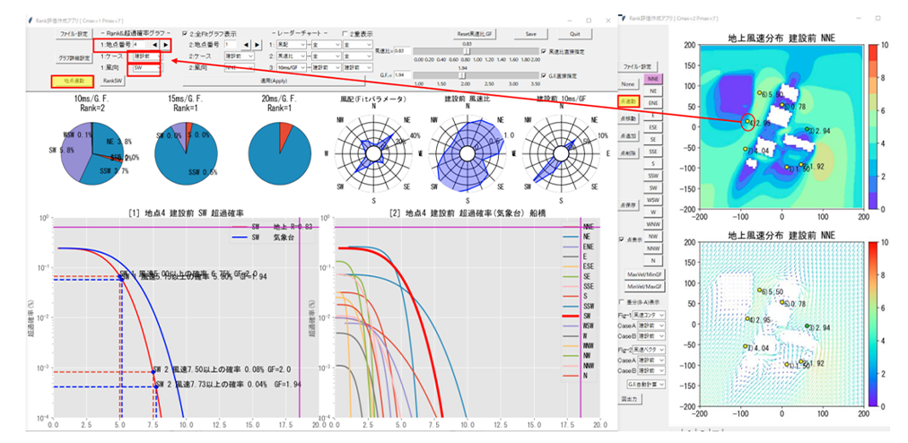 風環境の評価は基本的に年間における強風や弱風の出現頻度やエリア面積を算出する必要があります。その際の検討項目は多数あるため、一般に評価プロセスが複雑になります。これを解決するためのシステムがWindEval です。例えば評価マップ内の地点をピックすればその地点のワイブル分布や強風・弱風の出現頻度が表示できます。これにより強風対策や適風(弱風含む)の検討が容易になります。