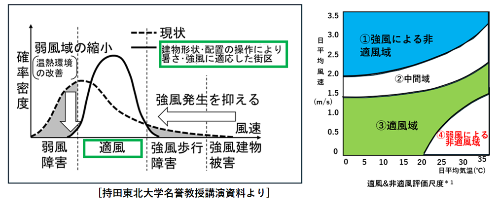 すなわち都市においては、「強風障害(ビル風)」と「弱風障害」(風通し障害)が混在する状況となっています。