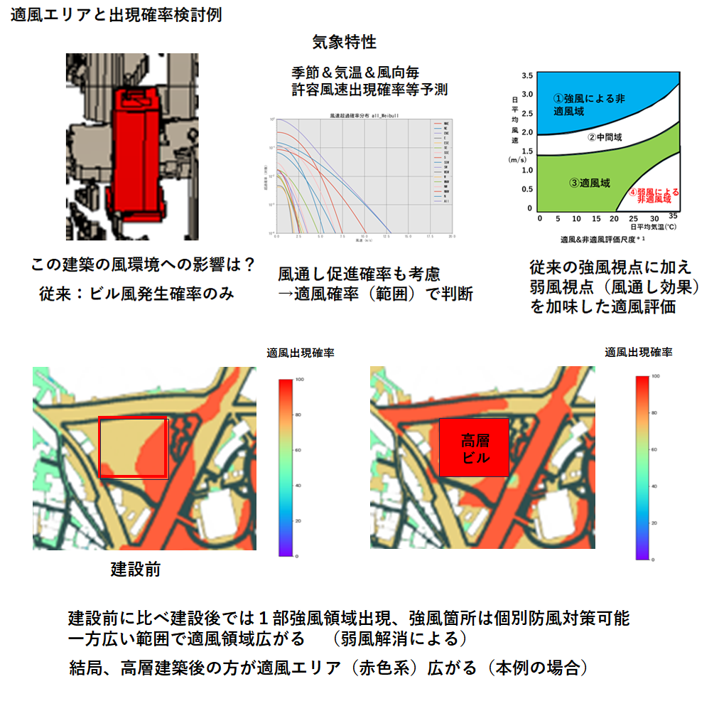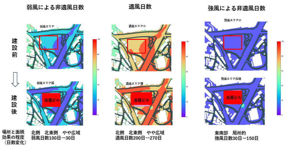 建設前に比べ建設後は弱風エリアが減少し、その分が適風エリアに加わること等が分かります。